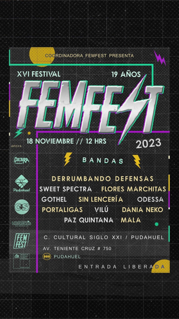 Santiago, 15 de noviembre de 2023 – El Festival Femfest Mujeres y Disidencias 2023 se prepara para su XVI edición, prometiendo un evento único que combina música, activismo y reflexión. Con un cartel diverso de once bandas y solistas destacadas, charlas, talleres, obras de teatro y más, el festival tendrá lugar el próximo sábado 18 de noviembre a partir de las 14.00 horas en el Centro Cultural Siglo XXI de la comuna de Pudahuel.
